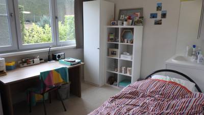 Studentenkamer gelegen op de eerste verdieping. Oppervlakte14 m². Volledig bemeubeld met bed, bureau, bureaustoel, kleerkast en koelka...