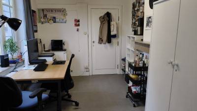 De kamer bestaat uit 2 delen: een slaapgedeelte met douche, een studeergedeelte met frigo, veel ramen, dus veel licht, op zoek naar een rust...