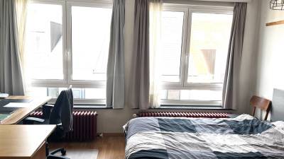 Moderne studentenkamer te huur met dubbelbed, eigen douche en toilet. Rolluik. Gemeenschappelijke keuken, eigen frigo in de kamer. De kamer ...