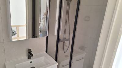 Gemeubelde studentenkamer met badkamer, kitchenette met frigo en microgolfoven, mezzanine met dubbel bed zonder matras. Aparte badkamer me...