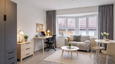 Dit gebouw bestaat uit 13 gerenoveerde studentenkamers. Elke kamer beschikt over een bed zonder matras, bureau met stoel, combi oven, kled...